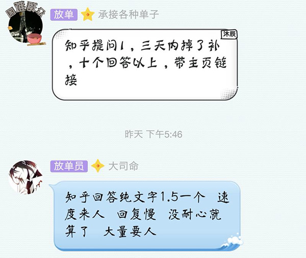 做了半年水军后,高洋已经开始独立接单,有网络营销公司的“大佬”找到他,说手里有些单子,让他放放,一天给他一百。他接到的常是倒手过一道的二手单,让他倒卖一些微博或知乎账户,并组建团队。“战斗”一天下来,高洋觉得挣的虽然是“小钱”,但“有总比没有好”。