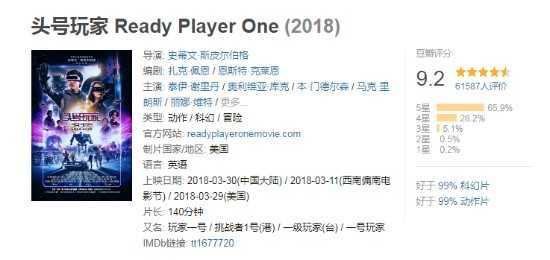 《头号玩家》国内票房突破2亿元 单日票房破亿 2018-04-01 12:42Nruan来源:游民星空评论3.5W34,904 斯皮尔伯格执导的科幻电影《头号玩家》于3月30日上映,两天的时间,内地票房已经突破2亿元,并且单日票房破亿,官方发布庆祝海报。作为一部商业影片,《头号玩家》目前在豆瓣上有超过6万个评价,评分高达9.2分。 影片中更是充满了游戏彩蛋,深受游戏迷们的追捧。你去影院看了吗? 点赞 https://www.nruan.com/56513.html 复制链接 复制链接