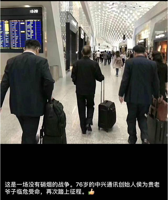 4月18日,一张中兴通讯创始人侯为贵拖着拉杆箱现身机场的照片,在网上热传。经确认,照片上的三人分别是中兴董事长殷一民、总裁赵先明以及创始人侯为贵。照片中的配文写道“这是一场没有硝烟的战争。76岁的中兴通讯创始人侯为贵老爷子临危受命,再次踏上征程。”