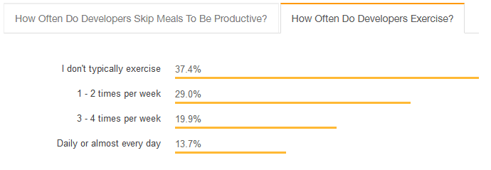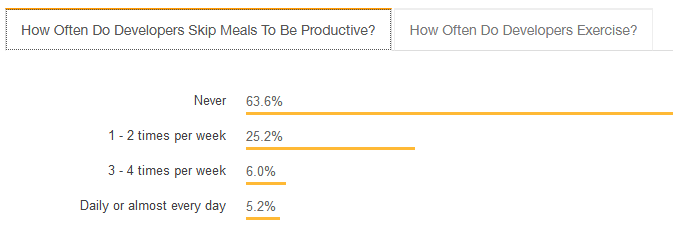调查显示,开发者在饮食方面比较规律,64% 的开发者都会按时吃饭。在锻炼情况方面,超过 60% 的受访者表示至少每周锻炼一次,但从整体分布来看,从不锻炼的开发者占比也不少。
