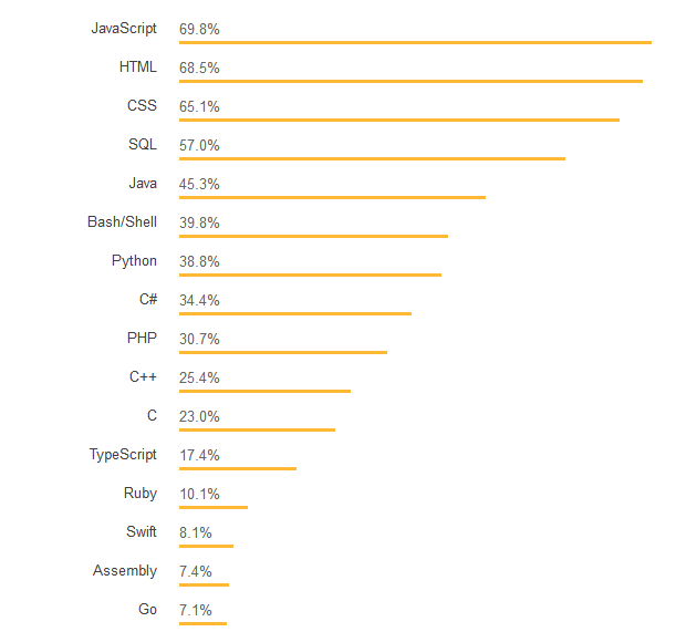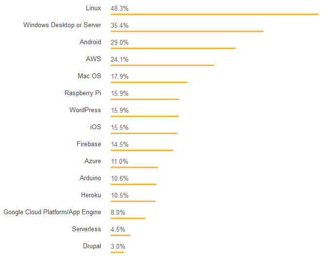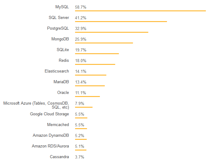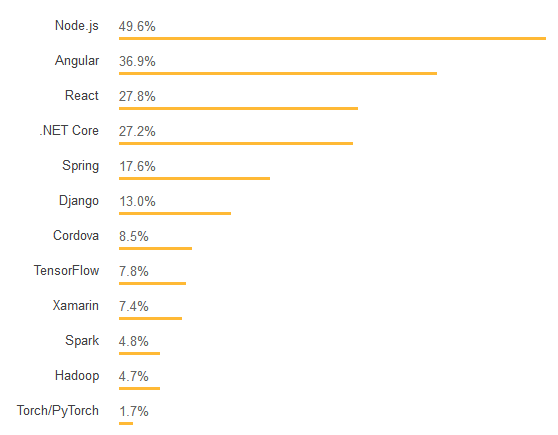 Node.js 和 AngularJS 仍然是此类别中最常用的技术,React 和 .Net Core 对许多开发人员来说也很重要。