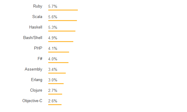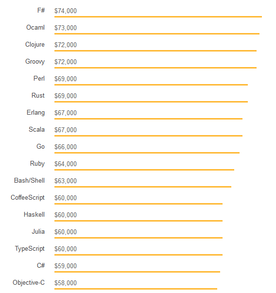 薪资计算器中的数字也可以与 Stack Overflow 2018 问卷调查中的高薪技术清单进行比较,其中 Scala 和 Go 语言在列表中的位置相对较高。