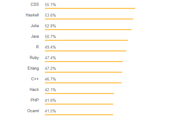 Stack Overflow 上几乎有一半的专业开发人员参与了开源项目。 参与开源的方式因语言而异。 超过 70% 的使用 Rust,Julia 和 Clojure 的开发人员参与开源,而使用 VBA,VB.NET 和 C#的开发人员中只有不到 40%。