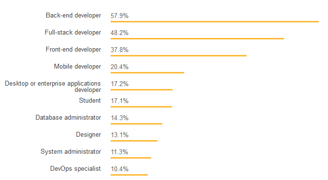 在职业占比的调查中,我们发现,前三分别是:后端开发、全栈开发和前端开发。有近 60% 的受访者将自己视为后端开发,大约 20% 的受访者认为自己是移动开发。
