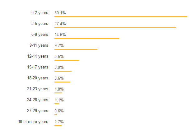 超过一半的受访者拥有五以内的专业编码经验。 使用 Cobol 和 Perl 等语言的开发人员编码经验最丰富,而使用 Matlab,Haskell 和 Kotlin 等则相反。