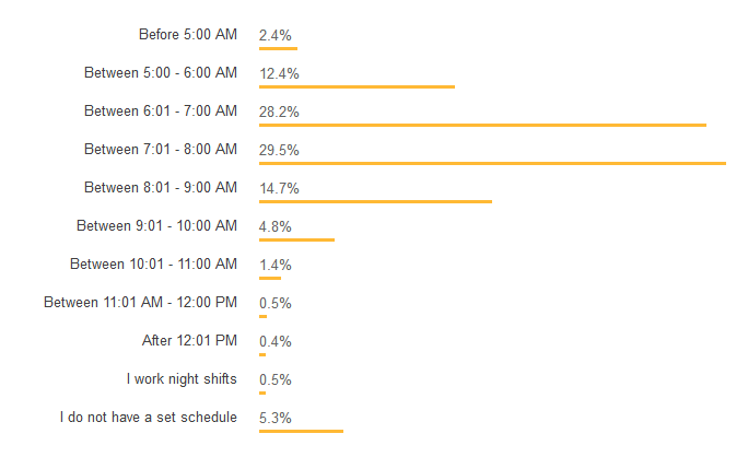 有的开发者可能准时下班到家,有点可能加班到深夜,有的可能天亮才躺在床上。不管什么情况,大多数开发者表示他们一般是 8 点起床。