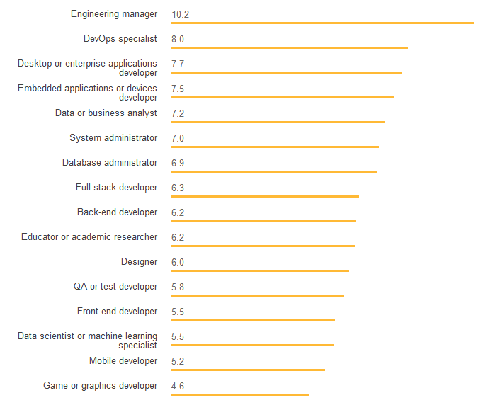 在不同软件开发领域工作的开发人员具有不同的工作经验。 调查发现,DevOps 专家和开发人员拥有最丰富的开发经验。 DevOps 作为一门学科和专业身份相对较新,但在这一领域工作的人员经验丰富。 游戏/图形开发人员和移动开发人员拥有最少的经验。