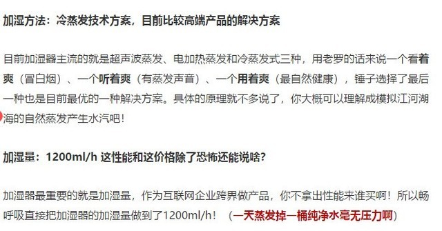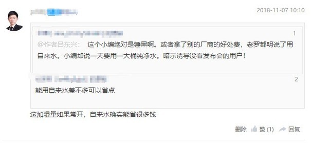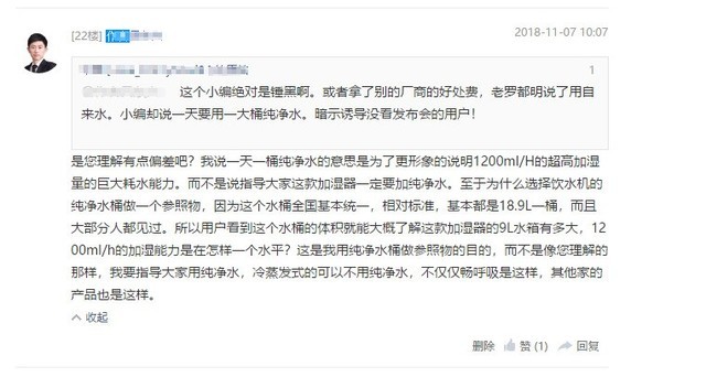 大家争议的点在于,网友认为小编说老罗的加湿器要加纯净水,而编辑的解释是用大家常喝的桶装水解释加湿量。