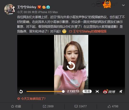 6月25日凌晨,@王兮兮Shirley 发布道歉视频,表示:“对不起,看到视频里面的我让你们失望了!在这里我向大家郑重道歉!是我鲁莽、冒失和冲动了!对不起!”