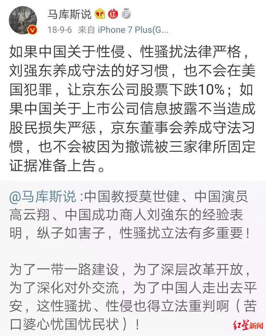马库斯说称,作为一名女性和一个母亲,自己平时最关注的就是女性话题。刘强东“明州事件”发生后,自己第一时间关注到了,“根据网上披露的民事起诉书内容,美国警方公布的调查结果,美国警方透露的一些调查内容等,我写了一篇微博,还原了事发当晚的整个过程,这篇文章的转发量有5万多,大约两三天后我发现我的这篇文章被删除了。”