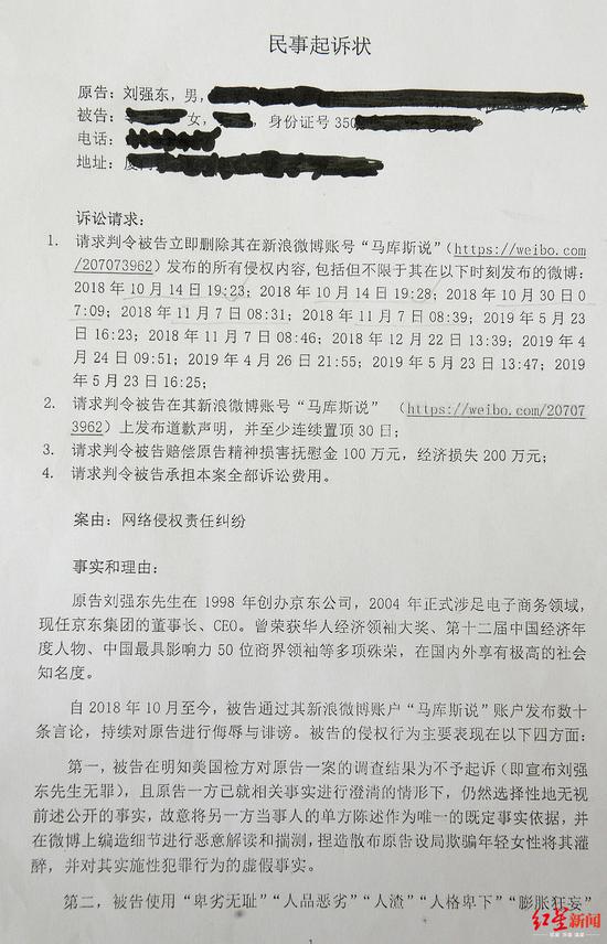 在收到法院起诉通知后的第十天,7月26日,马库斯说在自己的微博上公开了收到的刘强东方面发来的起诉状,截至记者发稿时,这条微博已经有2万多转发和7万多点赞。