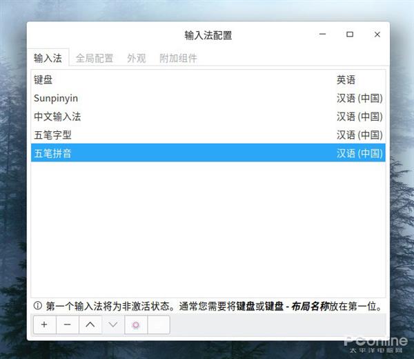 输入法除了内置了号称Linux下最好用的Sunpinyin外,还意外地加入了两款五笔输入法。
