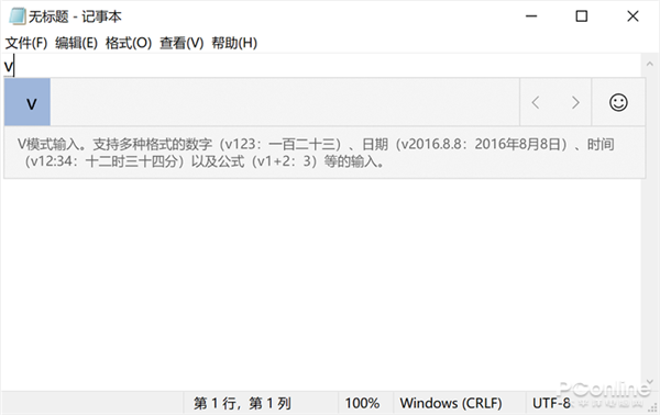 Win10输入法同样支持这样的数字快捷输入方案。输入“v”后,可以看到Win10输入法支持多格式数字、日期、时间乃至公式输入,还带有简单说明,非常好上手,大大提高了输入效率。