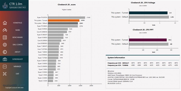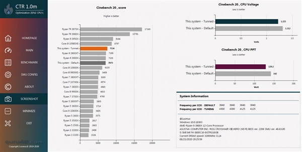 根据实际测试,CTR在锐龙9 3900X上能将频率提升大约7%,同时功耗降低9.5%,线程撕裂者3960X可以频率提升5%、功耗降低4.5%。