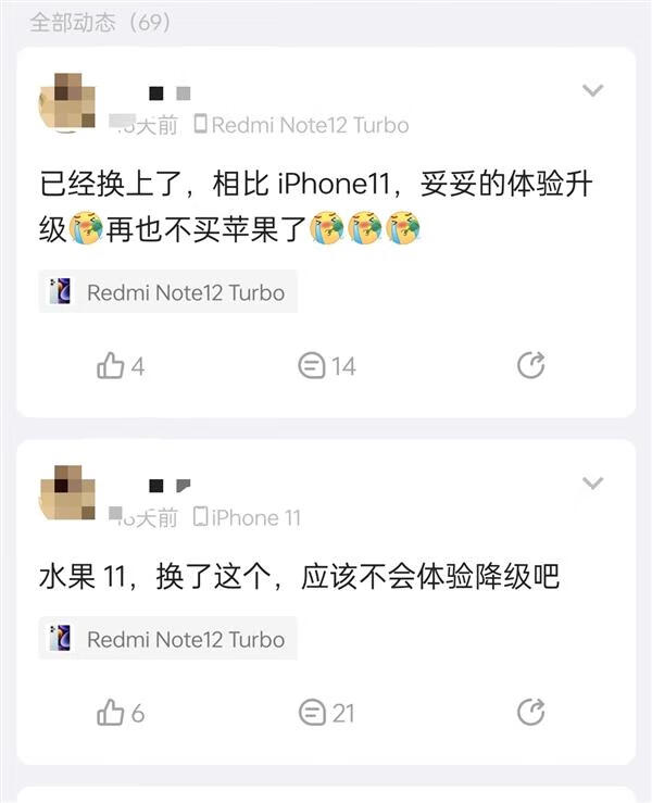 酷安一位iPhone 11用户换上了Redmi Note 12 Turbo。他说:“Redmi Note 12 Turbo是妥妥的体验升级,以后再也不买苹果了”。作为Note系列性能最强机型,Redmi Note 12 Turbo核心配置是骁龙7+ Gen2芯片、LPDDR5内存、UFS 3.1闪存。它的CPU性能和骁龙8+很接近。